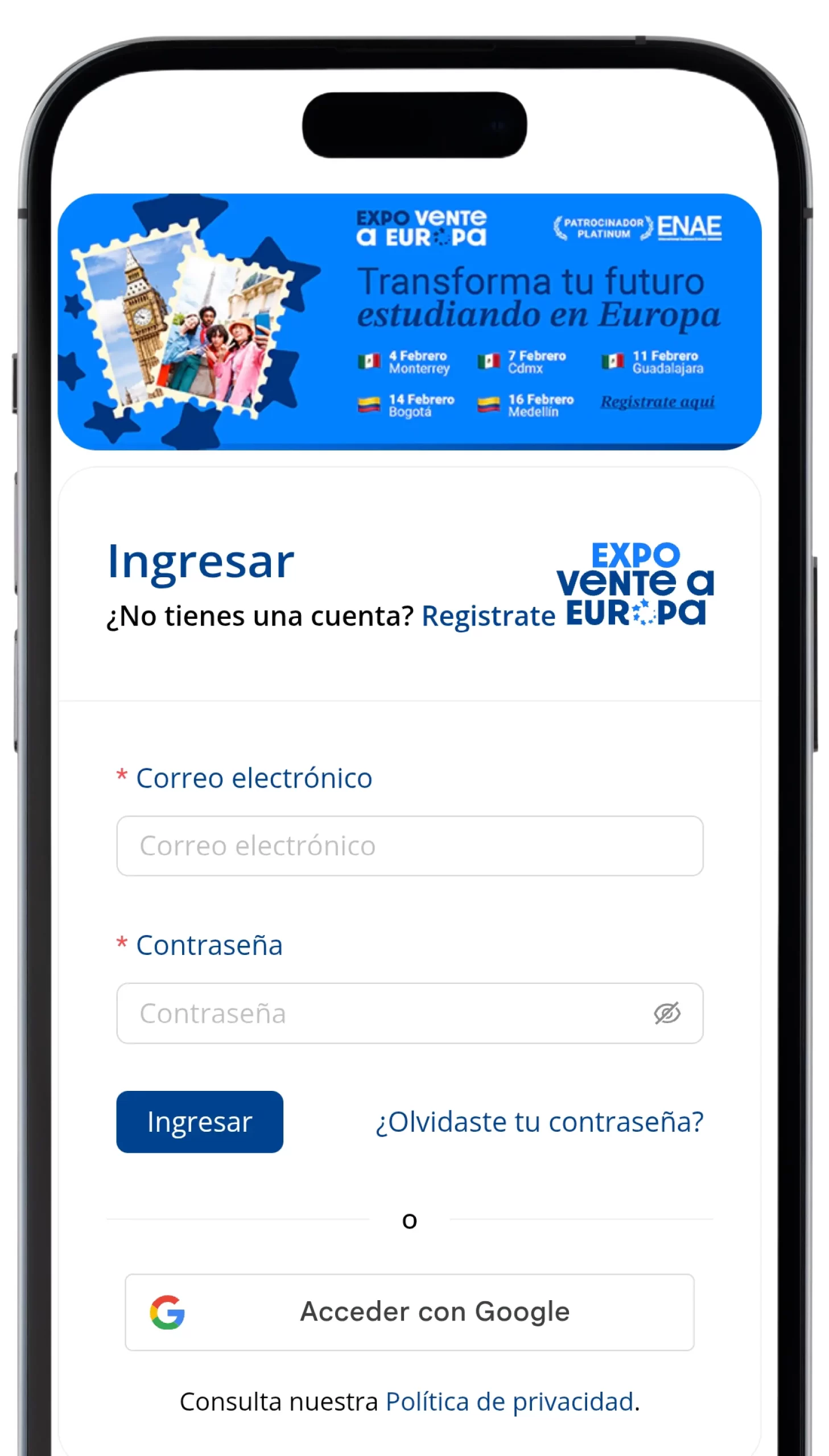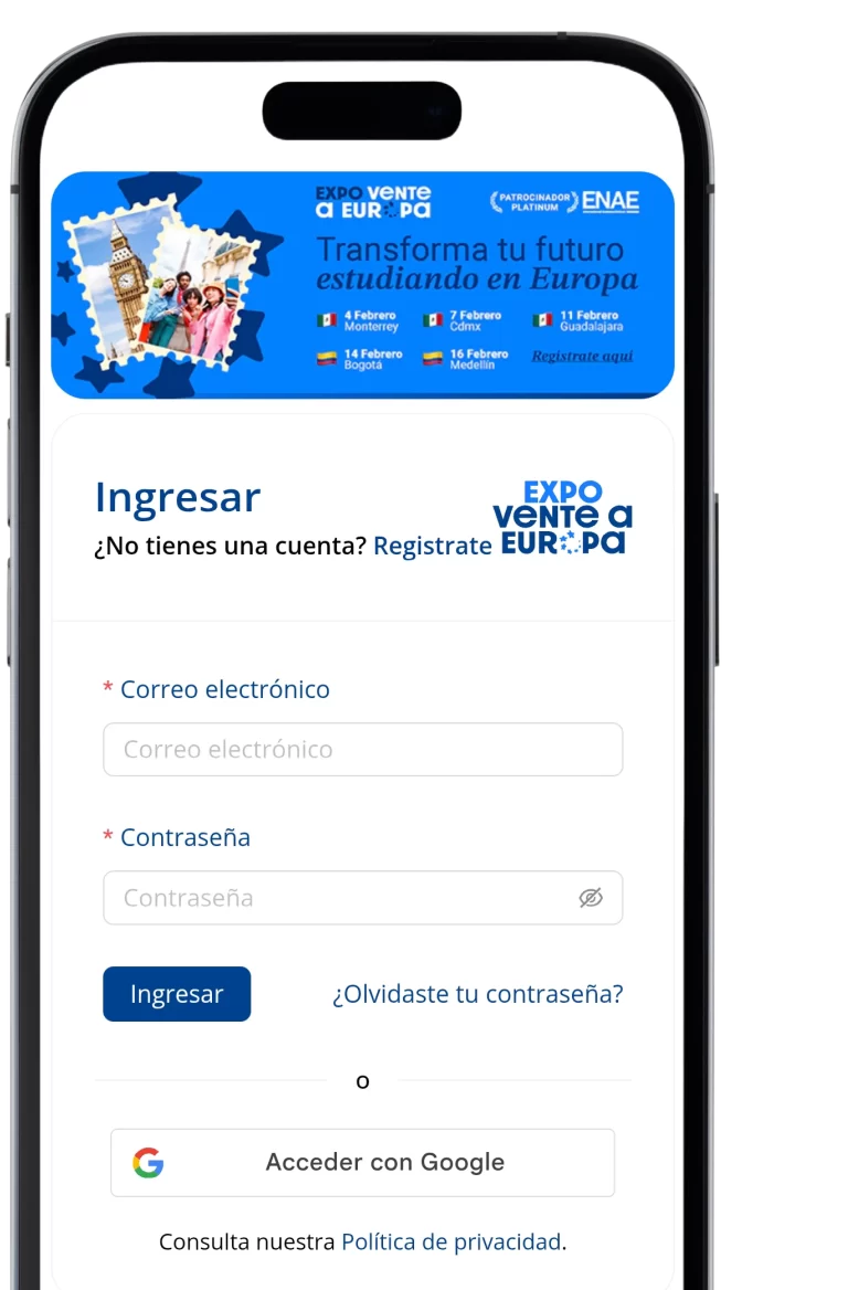 Registrarte en cualquier expo y obtienes acceso exclusivo a nuestra plataforma móvil y web que te acompaña tu camino hacia Europa.